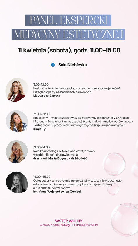 Zapraszamy na Panel ekspercki medycyny estetycznej, który odbędzie się 11 kwietnia 2026 r. (sobota) w Poznaniu. Wydarzenie stanowi część programu targów LOOK i beautyVISION. To wyjątkowa okazja, aby poznać najnowsze terapie, sprawdzone protokoły zabiegowe oraz praktyczne doświadczenia ekspertów z branży. Udział w panelu jest możliwy w ramach biletów na targi.